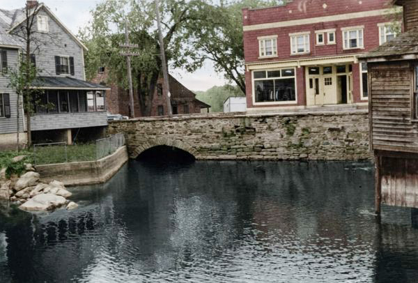 This lovely stone bridge was built in the late 1860s or early 1970s. It was demolished in 1963. In the background right is the old Russell store which was demolished in 2019. To the left is the Sexton House which burned down in 1983. In the background left is the Old Stone Mill which is still standing. Delta Mill Society Photo Archive, MNR Collection. Colourized by kww.